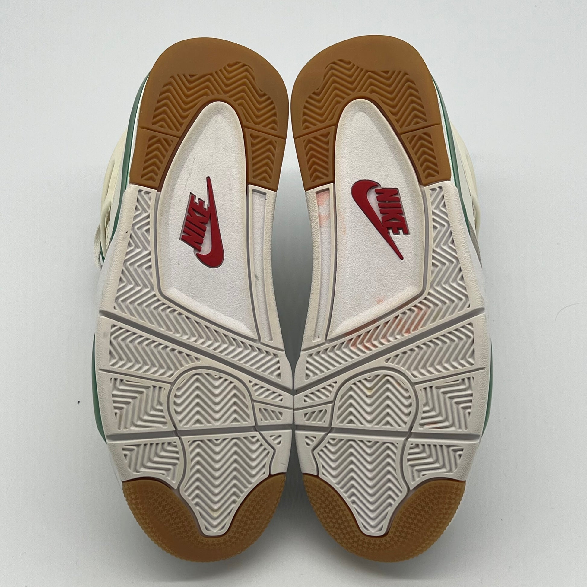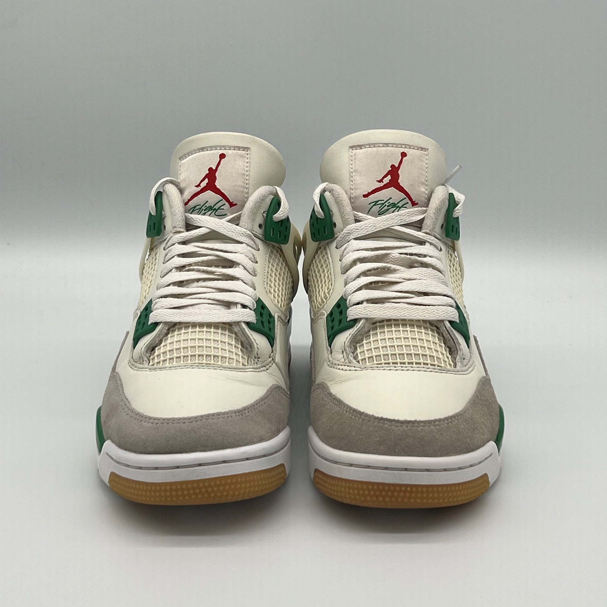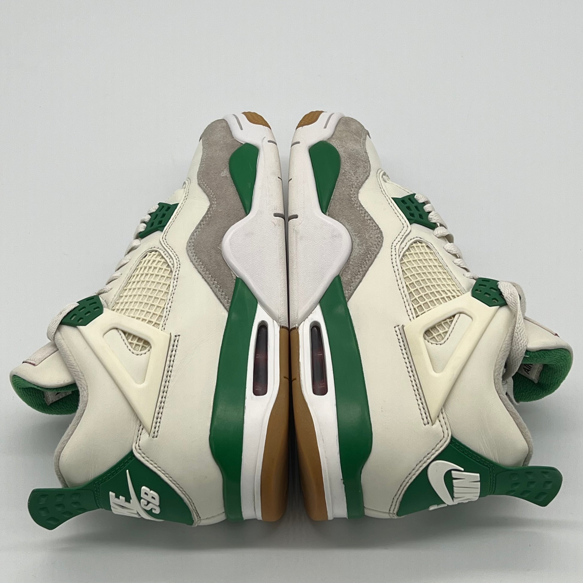 The Jordan 4 Retro SB Pine Green used a white leather upper with a Neutral Grey suede mudguard. The limited edition sneakers sit on top of a white and Pine Green midsole which is highlighted by a red air unit. Nike used a gum outsole to help with increased grip while skateboarding.