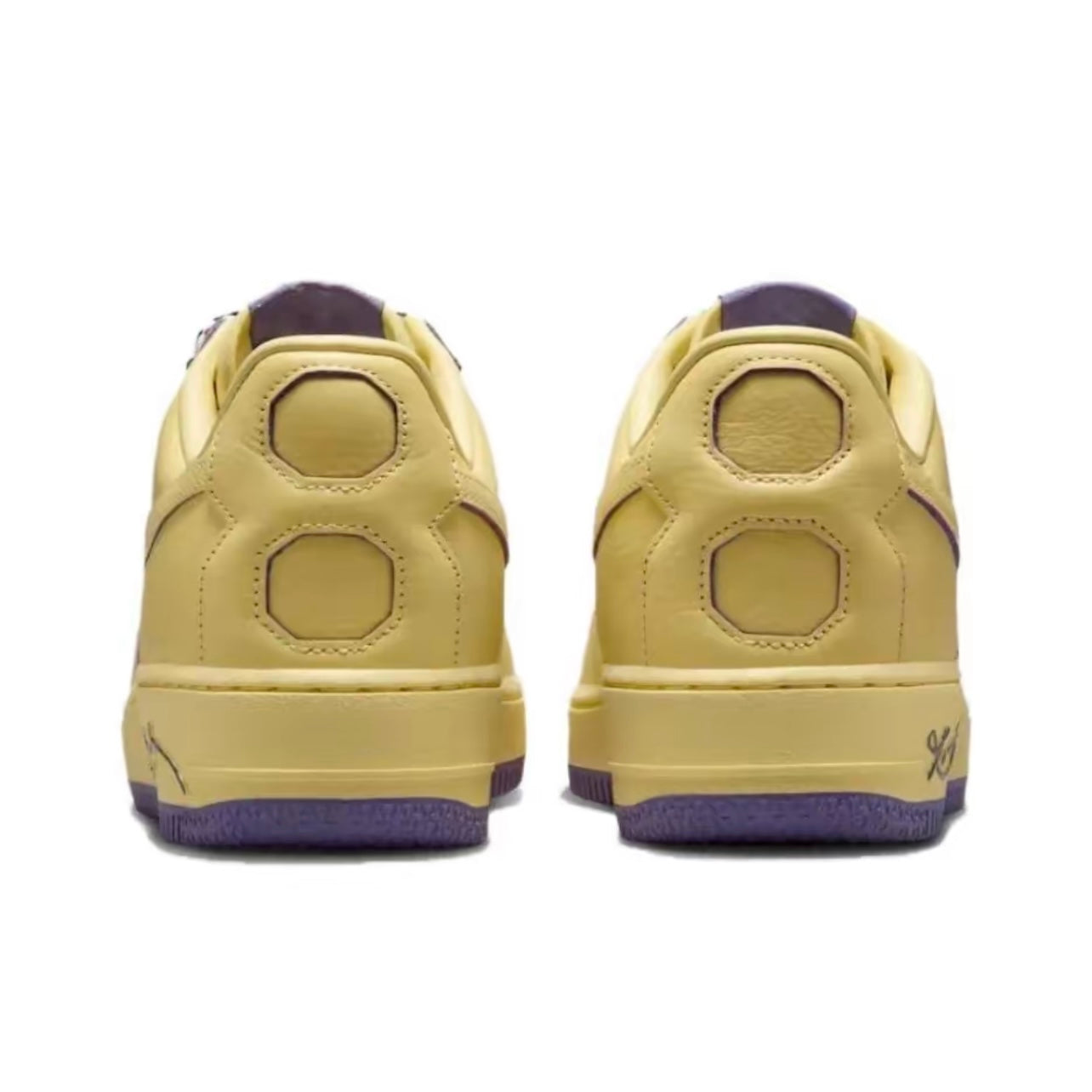The Kobe Bryant x Nike Air Force 1 Low Protro 'Mamba Mentality' features a pale yellow leather upper, secured with wide patterned laces and accented with contrasting hints of purple along the edges. An oversized '8' - Kobe Bryant's first jersey number with the LA Lakers - is appliqued on the back heel, while the athlete's sheath logo appears on the purple woven tongue tag. This Protro edition of the AF1 packs a drop-in React foam insole for responsive cushioning. The sneaker is mounted on a durable cupsole, highlighted by Kobe's signature on the lateral sidewall.