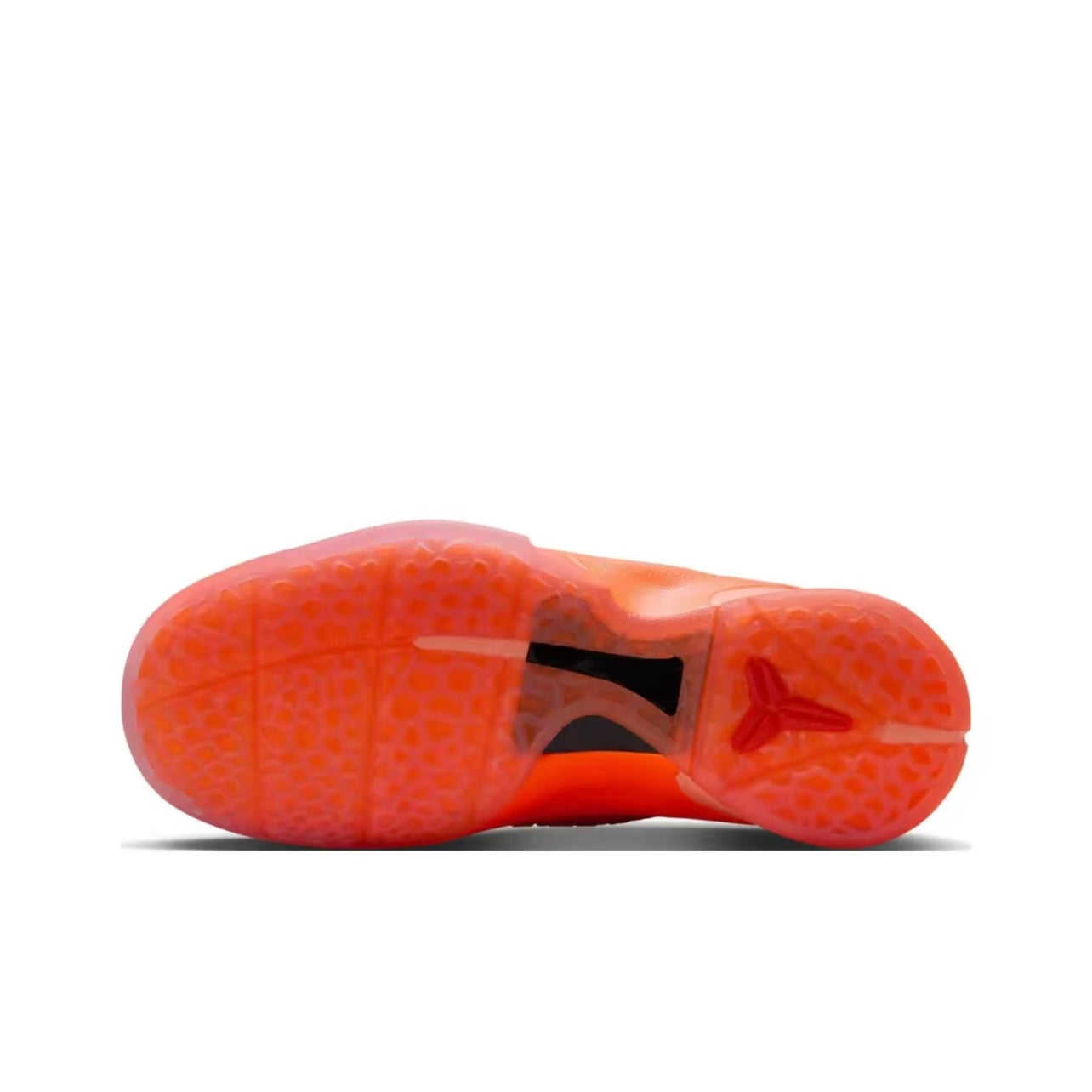 Made for big kids, the Nike Zoom Kobe 6 GS 'Total Orange' showcases a bold citrus hue on a micro-mesh upper covered in polyurethane 'islands,' creating a reptilian texture that plays off Kobe Bryant's 'Black Mamba' persona. Kobe's molded sheath logo decorates the tongue in metallic silver, matching the printed Swoosh that graces the quarter panel. The sneaker rides atop a matching orange Cushlon midsole with Zoom Air cushioning in the forefoot.
