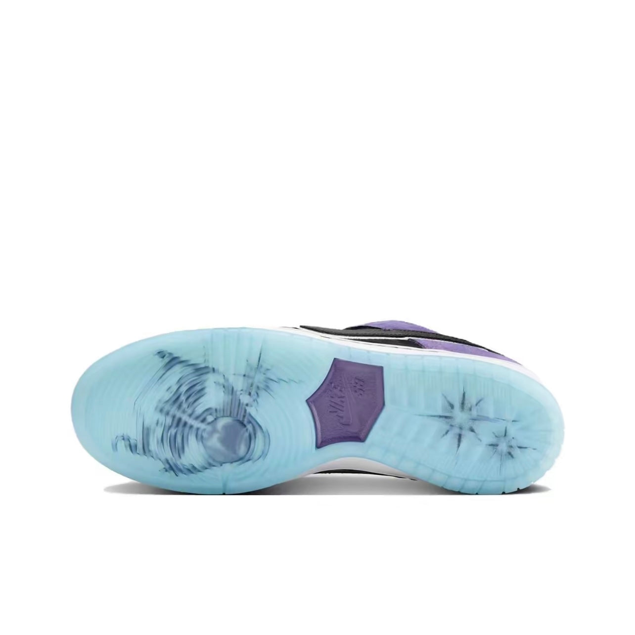 The Hayley Wilson x Nike Dunk Low SB 'Court Purple' presents the Australian skater's debut colorway of the classic silhouette. Outlined in white trim, a black leather Swoosh adorns the upper, which combines a black suede quarter panel with Court Purple suede overlays at the forefoot and heel. White leather construction is utilized on the toe box. Lagoon Pulse accents land on the co-branded tongue tag and suede back tab, featuring a Nike wordmark in gothic lettering. Underpinning the sneaker is a blue-tinged translucent rubber outsole that reveals custom graphics.