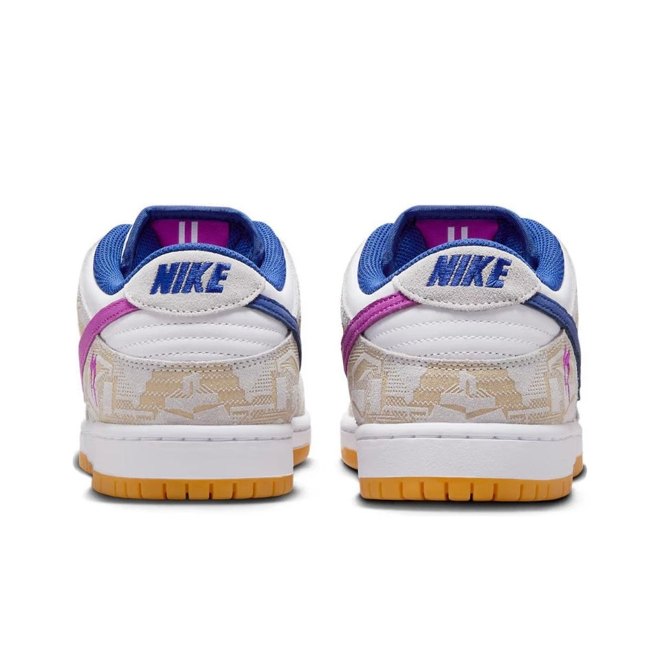 The Rayssa Leal x Nike Dunk Low SB debuts a special-edition colorway designed in collaboration with the Brazilian skateboarder. Mismatched blue and fuchsia Swooshes adorn the upper, featuring a white leather base with patterned grey suede overlays. Rayssa's personal logo decorates the lateral heel, while a trio of multicolored lace charms display digital smiley faces. The same graphic is embossed in a repeating pattern throughout each quarter panel. Underfoot, a gum rubber outsole provides grippy traction.