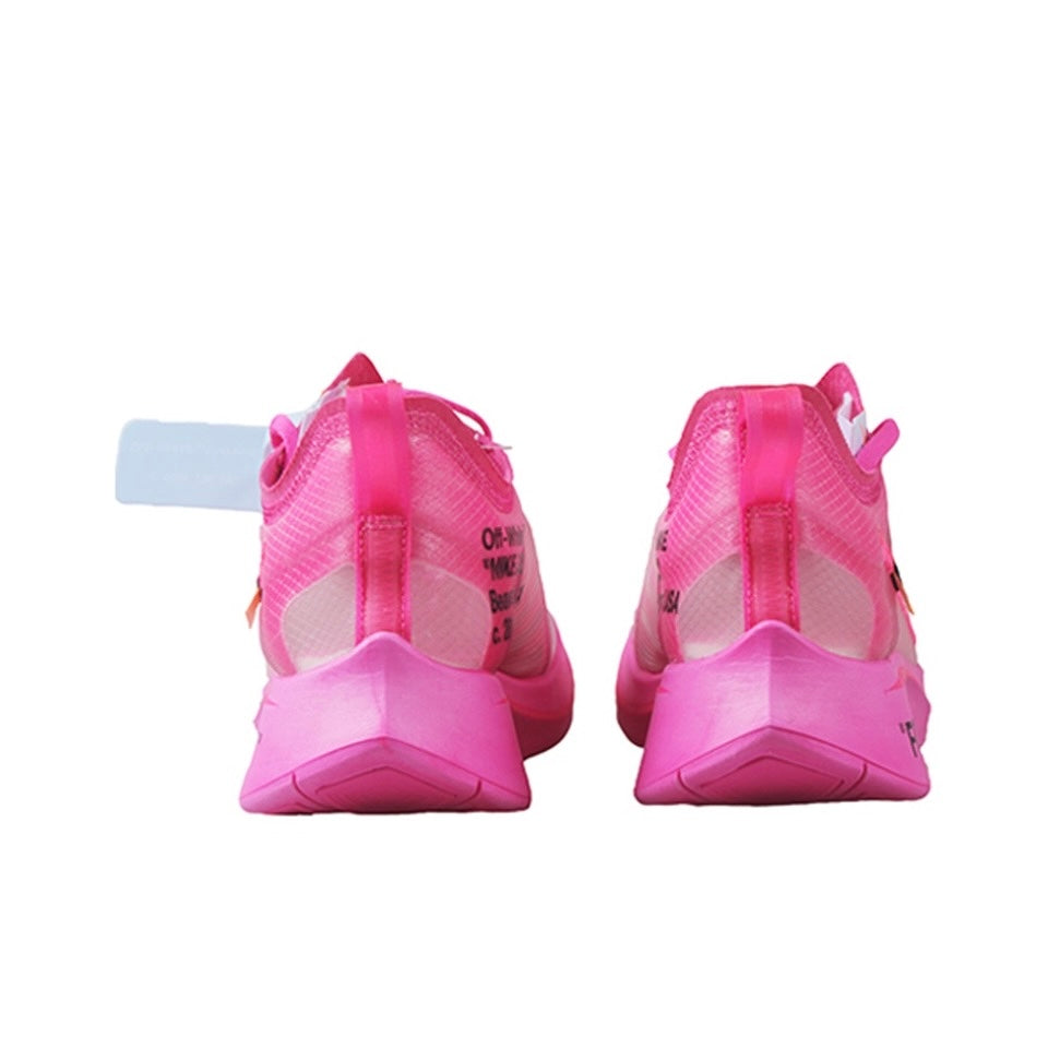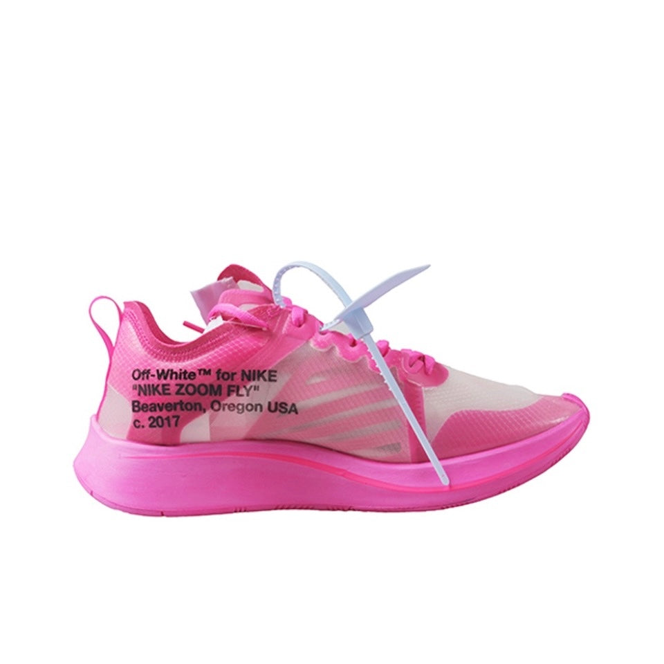 Virgil looks to continue his 2018 Off-White and Nike collab tour with the Nike Zoom Fly Off-White Pink. This sneaker comes with a translucent upper featuring pink accents, a pink Nike "Swoosh", pink midsole, and a pink sole.